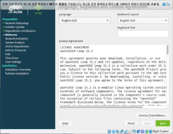 안녕하세요, 요즘 프로젝트로 너무 바빠서 퇴근하고 짬짬이 올리고 있습니다. 하루에 하나씩 올리는 것도 여간 힘든게 아니네요.. 어제는 VirtualBox 세팅까지 해보았는데요. 오늘은 OS 설치를 해보겠습니다. 전편에서 가상 openSUSE cd를 넣고 Installation 단계를 시작하면 메모장처럼 생긴게 나와서 여러 코드를 READ할 것입니다. 그 후 아래의 화면 창이 뜨는데 Language는 English로 해주세요.