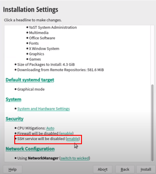 마찬가지로 다음은 SSH service will be disabled (enable) 버튼을 클릭하세요