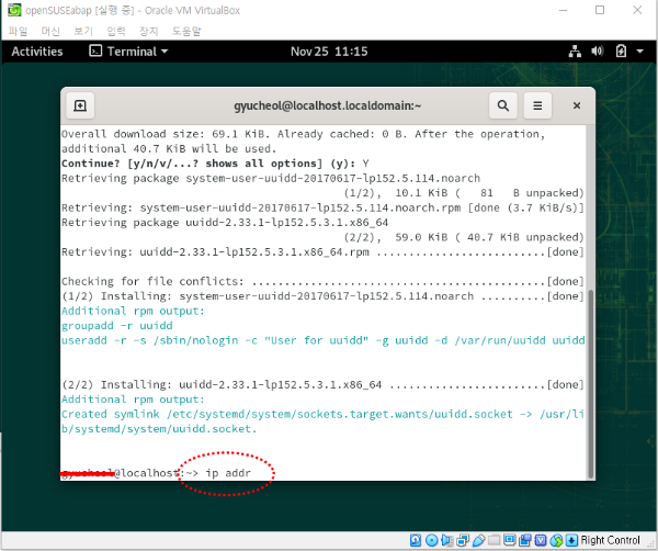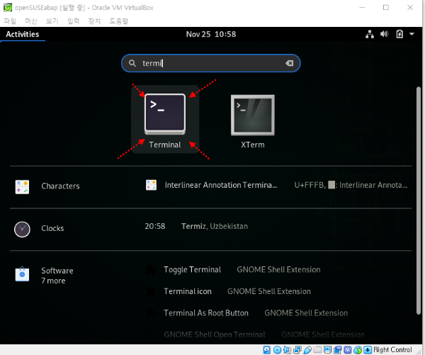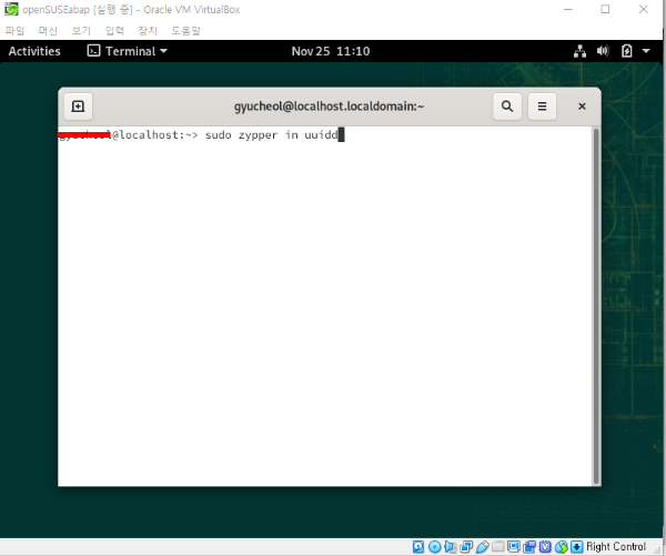 Terminal 아이콘을 누르면, 메모장 같은 화면이 뜨게됩니다. 거기에 'sudo zypper in uuidd' 입력하고