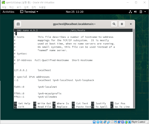 다음은 sudo nano /etc/hosts 를 입력해주세요. 그러면 아래와 같은 화면 창이 나타납니다.