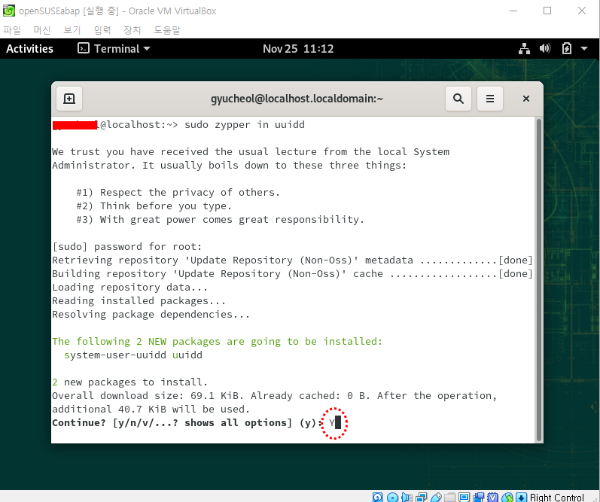 RUN을 누르면 PASSWORD를 입력하라는 창이 뜨게 됩니다. openSUSE 설치시 입력했던 비밀번호를 입력해주세요.