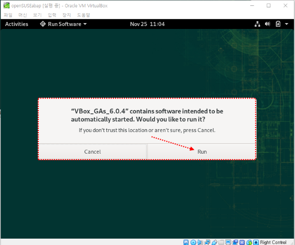 그러면 아래의 화면처럼 'VBOX_GAS_6.00~~ 메세지상자가 뜨면 'RUN'을 눌러줍니다.