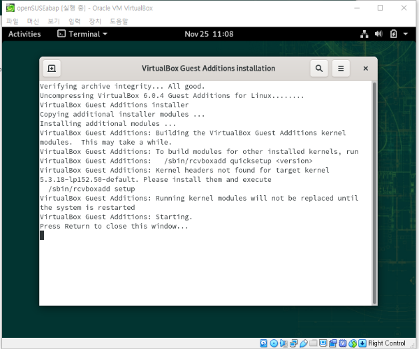 *혹시 아래의 메세지상자가 뜨지 않고 오류가 난다면 Virtualbox를 껏다가 켠 뒤 여태했던 진행방식을